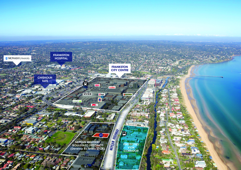 The site is located at the periphery of the Frankston CBD, approximately 550 metres north-west of the Frankston Railway Station and 320 metres east of Frankston foreshore. Surrounding land uses along Nepean Highway are predominantly low scale and commercial in nature (serviced apartments, motels, medical and allied health services etc). Adjoining land to the south and east is occupied by Quest serviced apartments. The existing low scale nature of development in this area was largely a result of the Commercial 2 Zoning (which does not permit residential land use) and an existing Design and Development Overlay (DDO6) which limited development in the area to a mandatory maximum height of 12 metres.