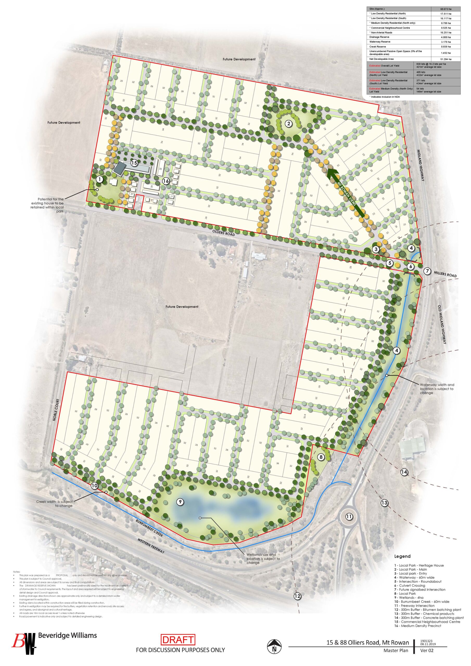 As per the Urban Structure Plan, commissioned by Beveridge Williams, the determined yield was for a residential development providing a yield of 830 allotments and 34.94 Hectares of Net Saleable Area. The masterplan for the development includes multiple local parks, wetlands, parkland abutting Burrumbeet Creek and a Neighborhood Commercial Centre.