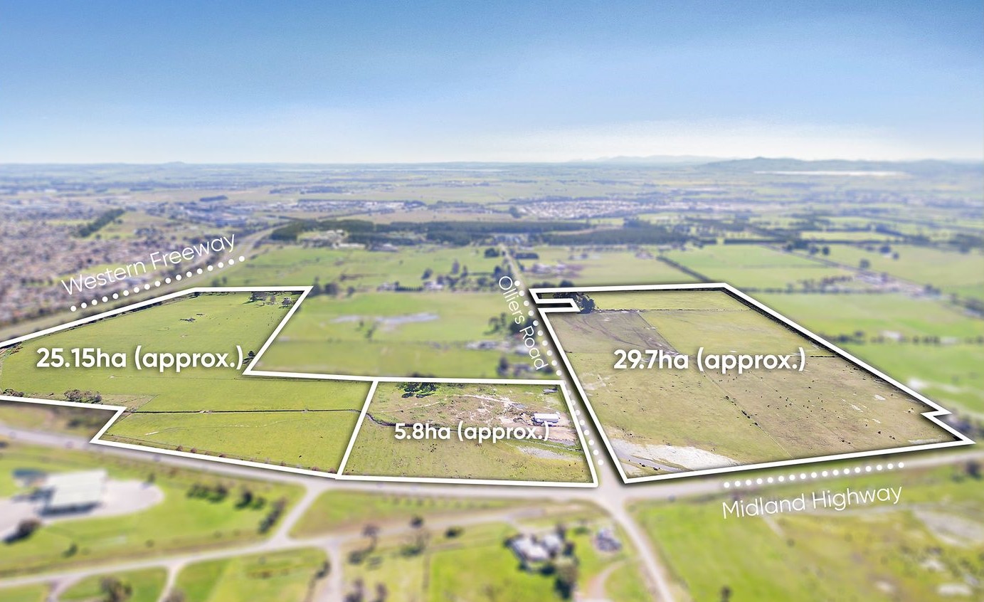 The site is generally flat and clear of vegetation. The site adjoins farming land to the north (owned by Ballarat Grammar), the Midland Highway to the east, the Western Freeway to the south and smaller farming properties/lifestyle blocks to the west. The Western Treatment plant is located approximately 800m to the west of the site.
